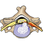 A herniated disc occurs when the gel-like center of a disc ruptures through a weak area in the tough outer wall. Neck or arm pain, numbness or tingling may result when the disc material compresses a spinal nerve. Treatment with medication, spinal injections, and physical therapy is the first step to recovery. Most people improve in 6 weeks and return to normal activity. If symptoms continue, surgery may be an option.