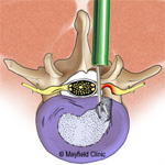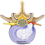 A herniated disc occurs when the gel-like center of a disc ruptures through a weak area in the tough outer wall. Back or leg pain, numbness or tingling may result when the disc material compresses a spinal nerve. Treatment with medication, spinal injections, and physical therapy is the first step to recovery. Most people improve in 6 weeks and return to normal activity. If symptoms continue, surgery may be an option.