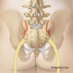 Sacroiliac (SI) pain is felt in the low back and buttocks. The pain is caused by damage to the joint between the spine and hip. Sacroiliac pain can mimic other conditions, such as a herniated disc or hip problem. Accurate diagnosis is important to determine the source of pain. Physical therapy, stretching exercises, pain medication, and joint injections are used first to manage the symptoms. Surgery can fuse the joint.